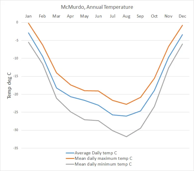 McMurdo is a coastal station and so is influenced by the sea. Once the winter pack ice starts to form and the sun disappears beyond the horizon, the temperature really starts to drop. The reappearance of the sun causes the temperature to rise rapidly again.