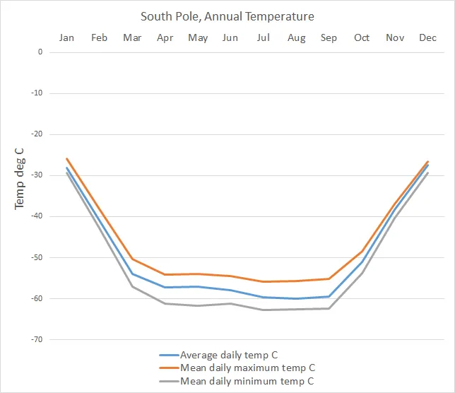 | Mean daily max °C | - 25.9 | - 38.1 | - 50.3 | - 54.2 | - 53.9 | - 54.4 | - 55.9 | - 55.6 | - 55.1 | - 48.4 | - 36.9 | - 26.5 | - 45.4 |