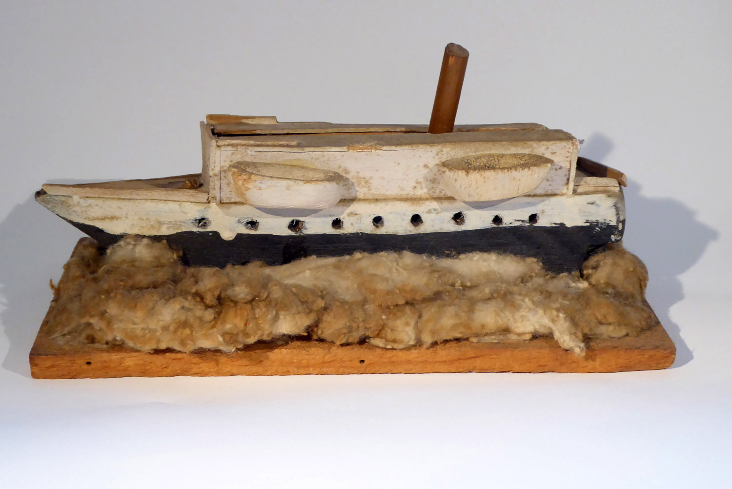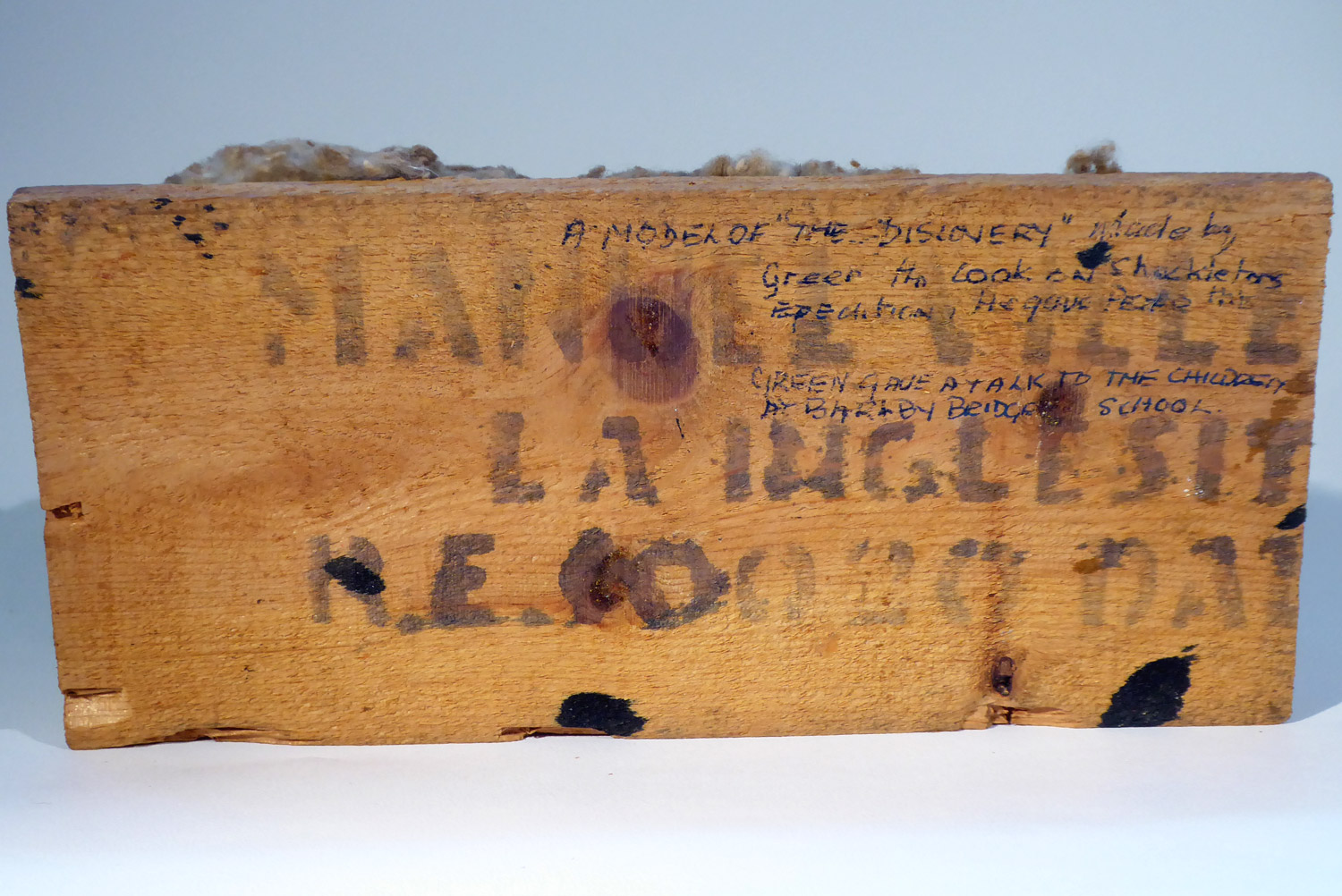 The surviving model of the Endurance given to Mr. Warham by Charles Green around 1965. Originally there were the three masts, a bowsprit, ventilators and the chimney from Mr Green's galley. The model base is about 230 x 100mm and it is about 100mm high, made of painted balsa wood with cotton wool or kapok "ice", it has been mistakenly labeled as "Discovery" on the underside of the base.