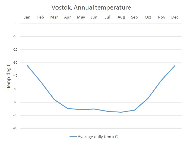 | Average daily temperature °C | - 28.2 | - 40.9 | - 54 | - 57.3 | - 57 | - 58 | - 59.7 | - 60 | - 59.4 | - 51.1 | - 38.3 | - 27.5 | - 49.4 |