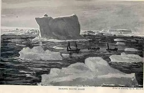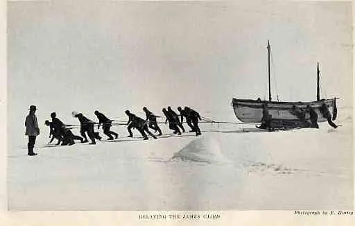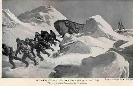 From a drawing. The lifeboats were loaded with supplies and equipment and used as sleds, the Endurance can be seen in the distance