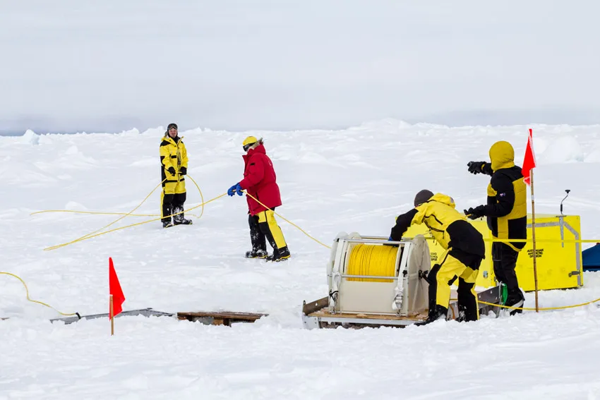 The ice you are standing on is 1m to 3m (3-10ft) thick floating on the Arctic Ocean, it is made of frozen sea water with some snow on top, sea level is usually no more than 1m below your feet and the sea bed another 4,260m below that. The ice may be flat and smooth or rough, having been broken up and refrozen together again.
