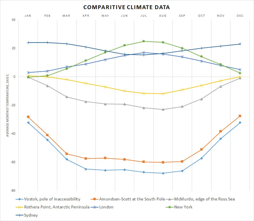 | McMurdo, edge of the Ross Sea | -0.2 | -6.3 | -14 | -17.4 | -19 | -19.1 | -21.7 | -22.8 | -20.8 | -15.5 | -6.7 | -0.8 |
