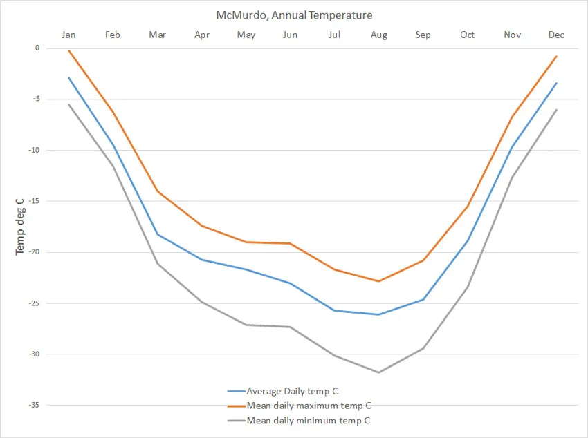 McMurdo is a coastal station and so is influenced by the sea. Once the winter pack ice starts to form and the sun disappears beyond the horizon, the temperature really starts to drop. The reappearance of the sun causes the temperature to rise rapidly again.