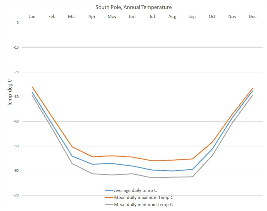 The temperature at the South Pole station consists of 6 months when it is fairly stable from April to September. After this, there is a 3 month period where the temperature rises to a peak and then drops again. This corresponds to light and dark. When it is permanently dark, the temperature is very stable. As the sun rises higher in the sky and has more heating power, so the temperature rises. After the longest day, December 21st, the sun falls again and so does the temperature.