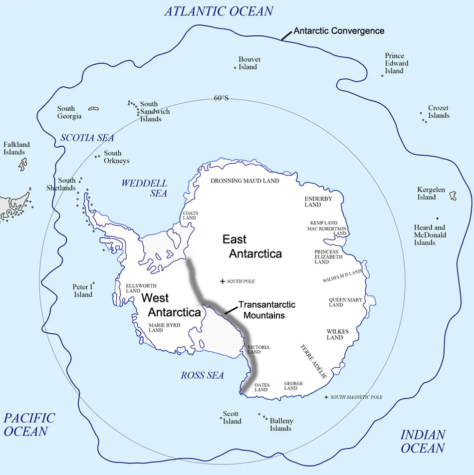 Antarctica is made up of of two main areas. East Antarctica and smaller West Antarctica which also has the Antarctic Peninsula.
