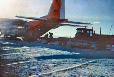 D8 tractor with sled backed up to a C-130 off-loading supplies