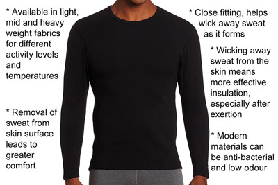 The layer of clothing next to the skin has two jobs to do, the obvious one of keeping you warm and then the equally important but less obvious one of removing perspiration from the skin so it doesn't cause chilling later on.