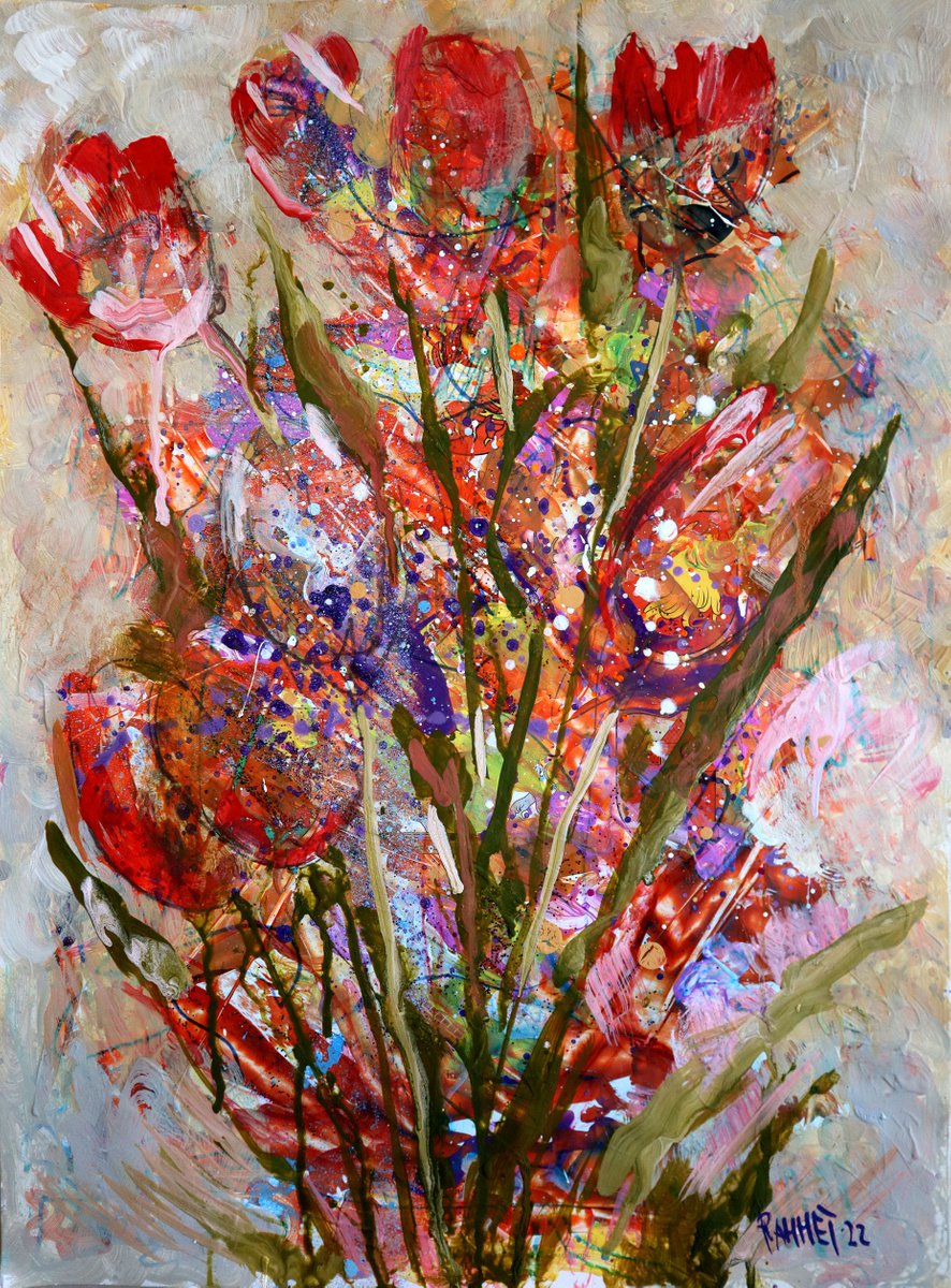 |  Impressionistic Botanical Acrylic Painting By Rakhmet Redzhepov, 34 X 24", Tulips Red 3, Original Artwork566 USD